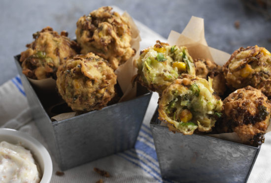 Shaved Brussels Sprouts Fritters with Bacon Aioli