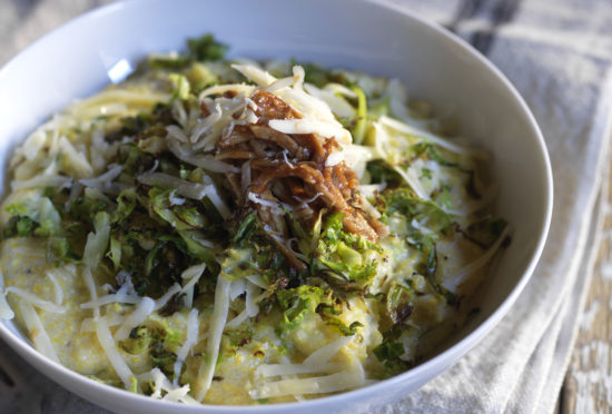 Shaved Brussels Sprouts with Maple Bourbon Pork & Cheddar Grits