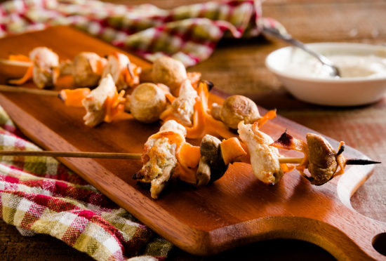 Grilled Chicken Skewers with Mushrooms and Sweet Potato “Fettuccine” with Spicy Mustard Dipping Sauce