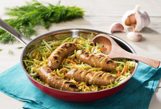 Braised Broccoli Slaw & Spicy Chicken Sausage with Mustard Sauce